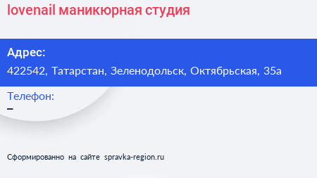 lovenail, маникюрная студия по адресу 422542, Татарстан, Зеленодольск, Октябрьская, 35а в дальнейшем Организация, размещена в следующих категориях: