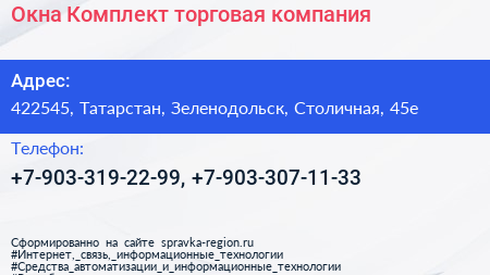 Окна Комплект, торговая компания по адресу 422545, Татарстан, Зеленодольск, Столичная, 45е в дальнейшем Организация, размещена в следующих категориях: