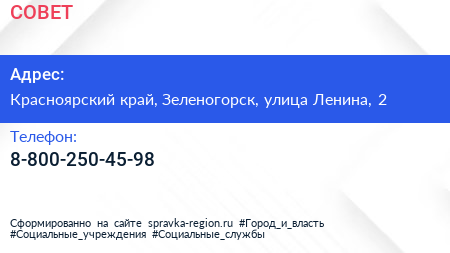 СОВЕТ по адресу Красноярский край, Зеленогорск, улица Ленина, 2 в дальнейшем Организация, размещена в следующих категориях: