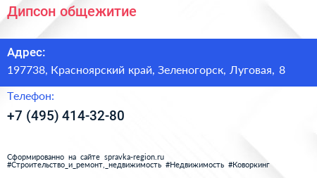 Дипсон, общежитие по адресу 197738, Красноярский край, Зеленогорск, Луговая, 8 в дальнейшем Организация, размещена в следующих категориях: