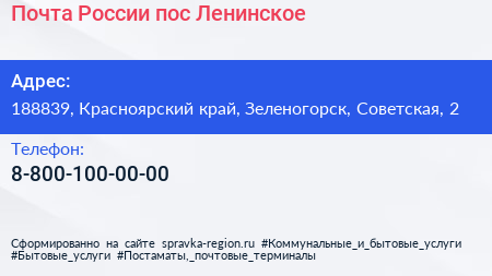 Почта России, пос. Ленинское по адресу 188839, Красноярский край, Зеленогорск, Советская, 2 в дальнейшем Организация, размещена в следующих категориях: