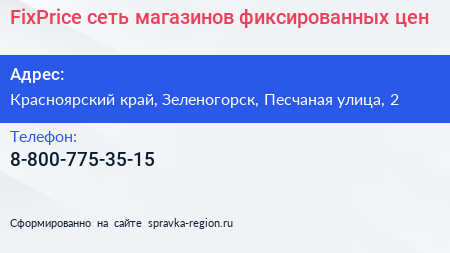 FixPrice, сеть магазинов фиксированных цен по адресу Красноярский край, Зеленогорск, Песчаная улица, 2 в дальнейшем Организация, размещена в следующих категориях: