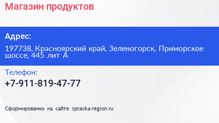 Магазин продуктов по адресу 197738, Красноярский край, Зеленогорск, Приморское шоссе, 445 лит А в дальнейшем Организация, размещена в следующих категориях: