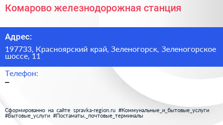 Комарово, железнодорожная станция по адресу 197733, Красноярский край, Зеленогорск, Зеленогорское шоссе, 11 в дальнейшем Организация, размещена в следующих категориях: