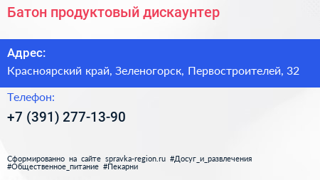 Батон, продуктовый дискаунтер по адресу Красноярский край, Зеленогорск, Первостроителей, 32 в дальнейшем Организация, размещена в следующих категориях: