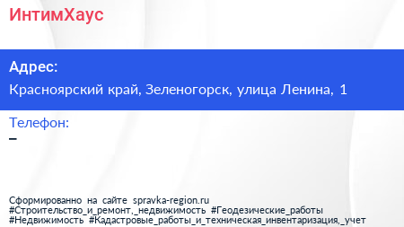 ИнтимХаус по адресу Красноярский край, Зеленогорск, улица Ленина, 1 в дальнейшем Организация, размещена в следующих категориях: