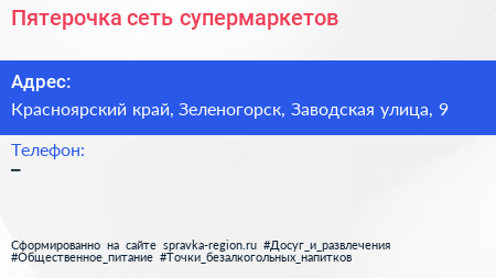 Пятерочка, сеть супермаркетов по адресу Красноярский край, Зеленогорск, Заводская улица, 9 в дальнейшем Организация, размещена в следующих категориях: