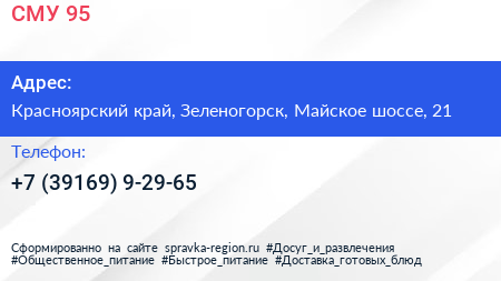 СМУ-95 по адресу Красноярский край, Зеленогорск, Майское шоссе, 21 в дальнейшем Организация, размещена в следующих категориях: