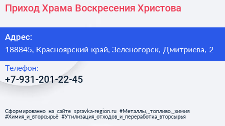 Приход Храма Воскресения Христова по адресу 188845, Красноярский край, Зеленогорск, Дмитриева, 2 в дальнейшем Организация, размещена в следующих категориях: