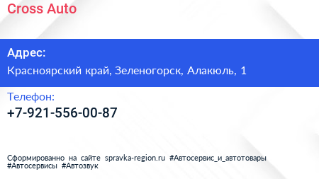Cross Auto по адресу Красноярский край, Зеленогорск, Алакюль, 1 в дальнейшем Организация, размещена в следующих категориях: