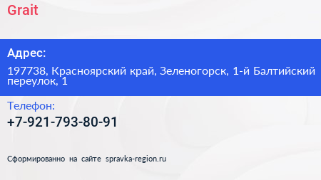 Grait по адресу 197738, Красноярский край, Зеленогорск, 1-й Балтийский переулок, 1 в дальнейшем Организация, размещена в следующих категориях: