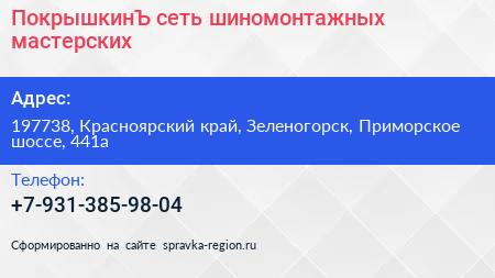 ПокрышкинЪ, сеть шиномонтажных мастерских по адресу 197738, Красноярский край, Зеленогорск, Приморское шоссе, 441а в дальнейшем Организация, размещена в следующих категориях: