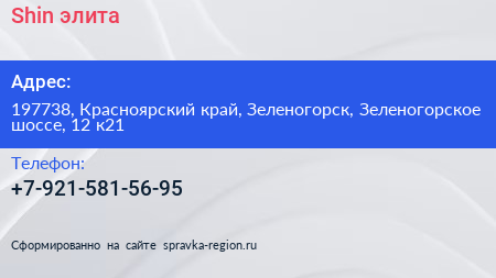 Shin-элита по адресу 197738, Красноярский край, Зеленогорск, Зеленогорское шоссе, 12 к21 в дальнейшем Организация, размещена в следующих категориях: