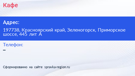 Кафе по адресу 197738, Красноярский край, Зеленогорск, Приморское шоссе, 445 лит А в дальнейшем Организация, размещена в следующих категориях: