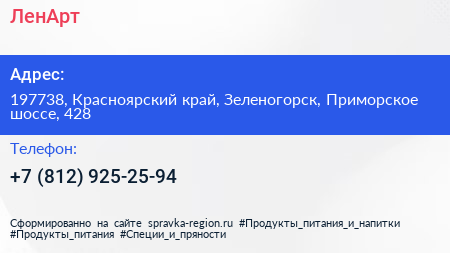 ЛенАрт по адресу 197738, Красноярский край, Зеленогорск, Приморское шоссе, 428 в дальнейшем Организация, размещена в следующих категориях: