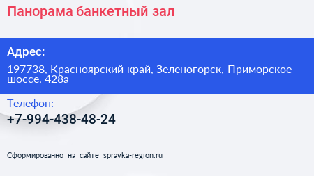 Панорама, банкетный зал по адресу 197738, Красноярский край, Зеленогорск, Приморское шоссе, 428а в дальнейшем Организация, размещена в следующих категориях: