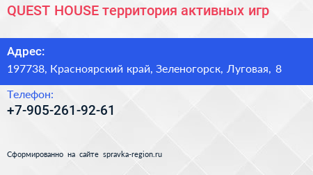 QUEST HOUSE, территория активных игр по адресу 197738, Красноярский край, Зеленогорск, Луговая, 8 в дальнейшем Организация, размещена в следующих категориях: