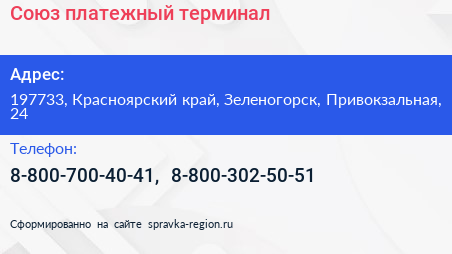 Союз, платежный терминал по адресу 197733, Красноярский край, Зеленогорск, Привокзальная, 24 в дальнейшем Организация, размещена в следующих категориях: