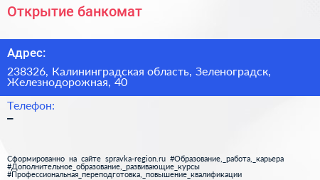 Открытие, банкомат по адресу 238326, Калининградская область, Зеленоградск, Железнодорожная, 40 в дальнейшем Организация, размещена в следующих категориях: