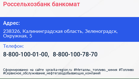 Россельхозбанк, банкомат по адресу 238326, Калининградская область, Зеленоградск, Окружная, 5 в дальнейшем Организация, размещена в следующих категориях: