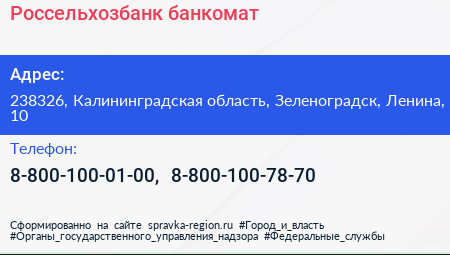 Россельхозбанк, банкомат по адресу 238326, Калининградская область, Зеленоградск, Ленина, 10 в дальнейшем Организация, размещена в следующих категориях: