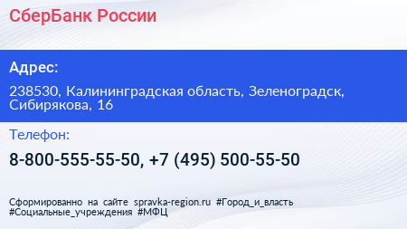 СберБанк России по адресу 238530, Калининградская область, Зеленоградск, Сибирякова, 16 в дальнейшем Организация, размещена в следующих категориях: