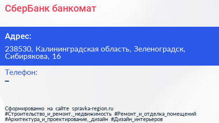 СберБанк, банкомат по адресу 238530, Калининградская область, Зеленоградск, Сибирякова, 16 в дальнейшем Организация, размещена в следующих категориях: