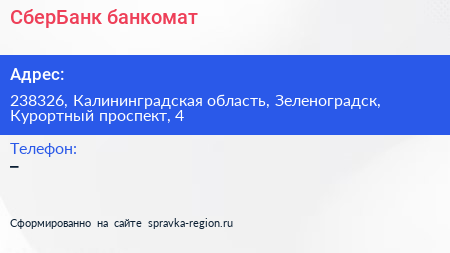 СберБанк, банкомат по адресу 238326, Калининградская область, Зеленоградск, Курортный проспект, 4 в дальнейшем Организация, размещена в следующих категориях: