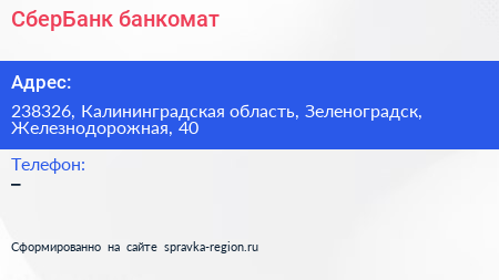 СберБанк, банкомат по адресу 238326, Калининградская область, Зеленоградск, Железнодорожная, 40 в дальнейшем Организация, размещена в следующих категориях: