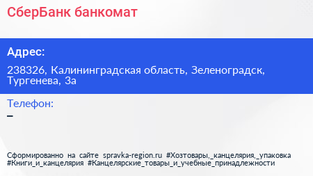 СберБанк, банкомат по адресу 238326, Калининградская область, Зеленоградск, Тургенева, 3а в дальнейшем Организация, размещена в следующих категориях: