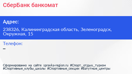 СберБанк, банкомат по адресу 238326, Калининградская область, Зеленоградск, Окружная, 15 в дальнейшем Организация, размещена в следующих категориях: