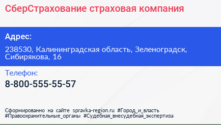 СберСтрахование, страховая компания по адресу 238530, Калининградская область, Зеленоградск, Сибирякова, 16 в дальнейшем Организация, размещена в следующих категориях: