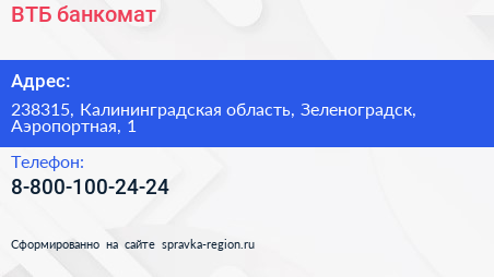 ВТБ, банкомат по адресу 238315, Калининградская область, Зеленоградск, Аэропортная, 1 в дальнейшем Организация, размещена в следующих категориях: