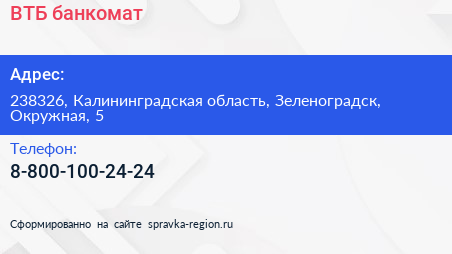 ВТБ, банкомат по адресу 238326, Калининградская область, Зеленоградск, Окружная, 5 в дальнейшем Организация, размещена в следующих категориях: