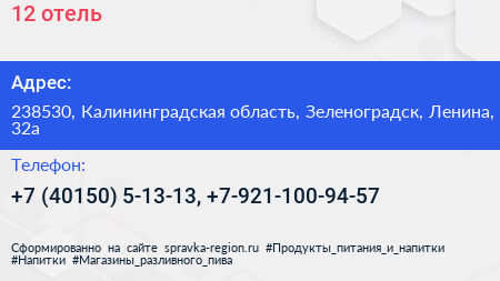 12, отель по адресу 238530, Калининградская область, Зеленоградск, Ленина, 32а в дальнейшем Организация, размещена в следующих категориях: