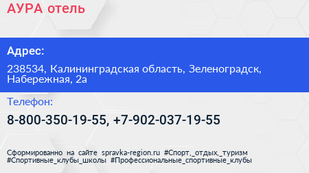 АУРА, отель по адресу 238534, Калининградская область, Зеленоградск, Набережная, 2а в дальнейшем Организация, размещена в следующих категориях: