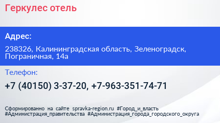 Геркулес, отель по адресу 238326, Калининградская область, Зеленоградск, Пограничная, 14а в дальнейшем Организация, размещена в следующих категориях: