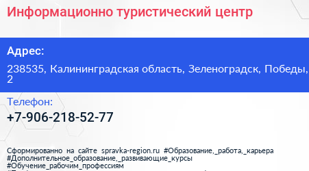 Информационно-туристический центр по адресу 238535, Калининградская область, Зеленоградск, Победы, 2 в дальнейшем Организация, размещена в следующих категориях: