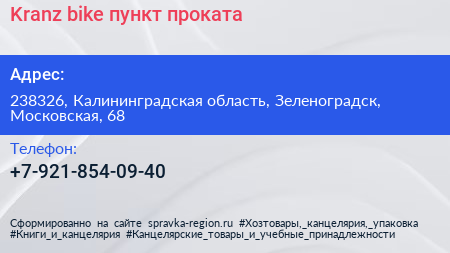 Kranz-bike, пункт проката по адресу 238326, Калининградская область, Зеленоградск, Московская, 68 в дальнейшем Организация, размещена в следующих категориях: