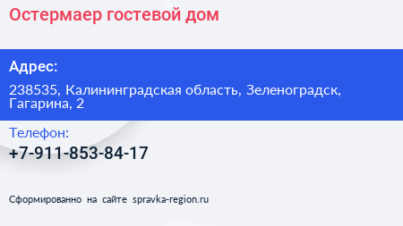 Остермаер, гостевой дом по адресу 238535, Калининградская область, Зеленоградск, Гагарина, 2 в дальнейшем Организация, размещена в следующих категориях: