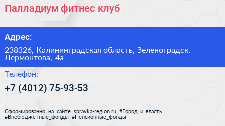 Палладиум, фитнес-клуб по адресу 238326, Калининградская область, Зеленоградск, Лермонтова, 4а в дальнейшем Организация, размещена в следующих категориях: