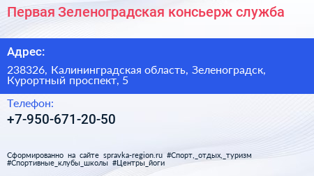 Первая Зеленоградская консьерж-служба по адресу 238326, Калининградская область, Зеленоградск, Курортный проспект, 5 в дальнейшем Организация, размещена в следующих категориях: