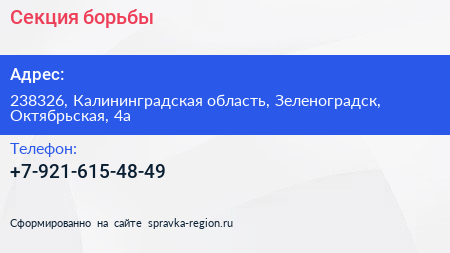 Секция борьбы по адресу 238326, Калининградская область, Зеленоградск, Октябрьская, 4а в дальнейшем Организация, размещена в следующих категориях: