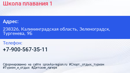 Школа плавания №1 по адресу 238326, Калининградская область, Зеленоградск, Тургенева, 9Б в дальнейшем Организация, размещена в следующих категориях: