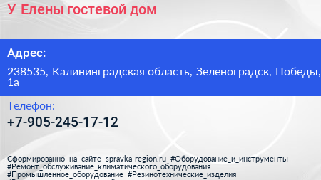 У Елены, гостевой дом по адресу 238535, Калининградская область, Зеленоградск, Победы, 1а в дальнейшем Организация, размещена в следующих категориях: