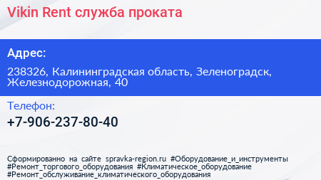 Vikin Rent, служба проката по адресу 238326, Калининградская область, Зеленоградск, Железнодорожная, 40 в дальнейшем Организация, размещена в следующих категориях: