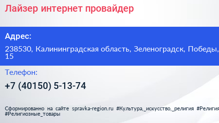 Лайзер, интернет-провайдер по адресу 238530, Калининградская область, Зеленоградск, Победы, 15 в дальнейшем Организация, размещена в следующих категориях: