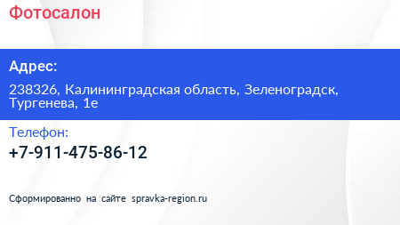 Фотосалон по адресу 238326, Калининградская область, Зеленоградск, Тургенева, 1е в дальнейшем Организация, размещена в следующих категориях: