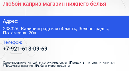 Любой каприз, магазин нижнего белья по адресу 238326, Калининградская область, Зеленоградск, Потёмкина, 20в в дальнейшем Организация, размещена в следующих категориях: