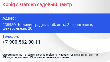 König’s Garden, садовый центр по адресу 238530, Калининградская область, Зеленоградск, Центральная, 20 в дальнейшем Организация, размещена в следующих категориях: